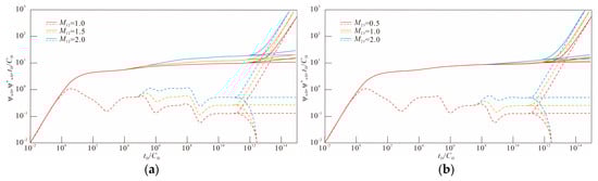 Figure 7a and Figure 7b, respectively, show the influence of M12 and M23 on the pressure dynamic curve. The magnitudes of these two parameters indicate the ease of fluid flow in their respective zones. The larger the values, the more difficult fluid flow becomes in zones 2 and 3. Figure 7a shows that the decrease in M12 values causes the pressure dynamic curves to decrease within Stage VI and all subsequent stages. Figure 7b shows that the decrease in M23 values caused the curves to decrease within Stage IX and all subsequent stages. Combining the effects of the two parameters, it can be concluded that, when a well is produced at a constant rate, the greater the flow capacity of fluids in zone 2 and zone 3, the lower the flow resistance encountered by fluids within the zone, and consequently, the smaller the formation pressure loss caused by fluid flow.