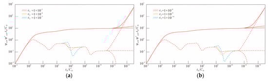 Figure 9a and Figure 9b, respectively, show the influence of ε2 and ε3 on the pressure dynamic curve. These two parameters measure the flow ability of fluid from matrix system to fracture system in zone 2 and zone 3. The higher the value, the stronger the inter-porosity fluid flow from the matrix to the fractures. Figure 9a indicates that increasing ε2 narrows and shallows the concavity of the Stage VII pressure dynamic curve, causing a pronounced leftward shift. Once ε2 rises beyond a certain level, the concavity completely disappears. Figure 9b shows the effect of ε3 on the pressure dynamic curve, which changes in a similar way to Figure 9a, but the effect occurs at Stage X. Combining the effects of the two parameters reveals that the stronger the capacity for inter-porosity fluid flow, the shorter the duration of the inter-porosity flow period.