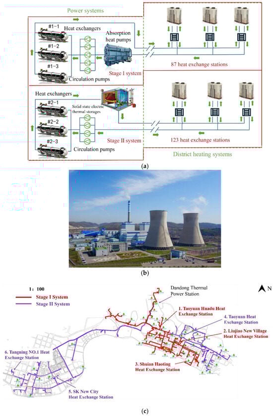 Liaoning power and district heating system; (a) electricity and district heating system; (b) panoramic view of the thermal power plant; (c) district heating systems.
