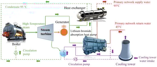 The flexibility potential must be positively exploited in four key areas, including flexibility retrofitting of thermal power plants, application of various energy storage technologies, demand-side flexibility research, and integrated and coordinated PHS operation, to establish a new power system dominated by renewable energy and address the imbalance between heat and power. Extensive research has been conducted in these areas. In terms of flexibility enhancement, the absorption heat pump (AHP) system can utilize commonly available low-grade thermal energy, demonstrating robust heat conversion capabilities [5,6]. This technology can effectively augment the heating capacity of systems, making it a focal point of interest for researchers. Single-effect AHPs are the most commonly used AHP cycles [7]. Various advanced systems have been proposed to enhance the cycle efficiency, including double-effect AHPs [8,9], generator-absorber heat exchange (GAX) heat pumps [10,11,12], and different AHPs utilizing refrigerants such as water [13] and ammonia [14,15]. These innovations aim to achieve a greater temperature increase between the heat input and output. Compared with traditional systems, AHP integration reduces steam extraction from turbines by over 40% [16,17].