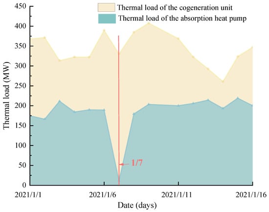 As shown in Figure 8b, the trends in the electrical and thermal loads of the thermal power plant over time were consistent, indicating a positive correlation between the two. On 18 and 22 December, a sudden increase in the electrical load occurred, whereas the thermal load of the thermal power plant decreased. This suggests that the thermal power plant may have prioritized shifting to the power generation mode to meet the electricity demand. In this case, the AHP compensated for the reduced thermal supply owing to the shift toward power generation by increasing its thermal output to maintain the thermal balance of the system.