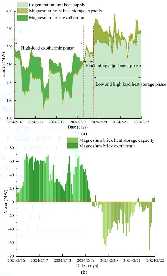 Stage II system heat load assumption, (a) cogeneration unit and solid-state electric storage unit load-bearing conditions, (b) magnesium brick heat storage and release.