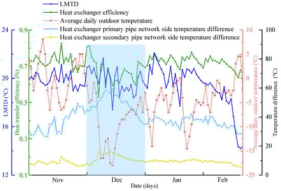 Figure 5 illustrates the correlation between the average daily outdoor temperature, the temperature differential between the primary and secondary pipe network inlets and outlets at the heat exchange station, and the corresponding heat exchange efficiency. The average daily outdoor temperature showed a negative correlation with both the temperature difference between the inlets and outlets of the primary pipe network and that of the secondary pipe network. As the outdoor temperature decreased, the user heat demand increased, prompting an increase in the water supply temperature or flow rate of the system to meet the heat load. The heat exchanger efficacy exhibited a positive correlation with the LMTD. As the outdoor temperature decreased, the heat transfer driving force within the heat exchanger decreased significantly, leading to a gradual decrease in the LMTD and a subsequent reduction in the heat exchanger efficiency.