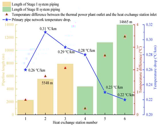 In addition, in the Stage I system, which encompasses Heat Exchange Stations 1–3, the primary pipeline includes numerous branch lines, where hot water is continuously extracted at multiple points. This frequent lateral heat extraction significantly increases the overall thermal losses and accelerates the rate of the temperature drop. Consequently, the temperature decreases per unit length from the thermal power plant to Heat Exchange Station 1 were lower than those observed at Stations 2 and 3. By contrast, the Stage II system, comprising Heat Exchange Stations 4–6, features a long and continuous main pipeline with relatively few branches. This configuration results in lower thermal losses and a consistently decreasing trend in the temperature drop per unit length.
