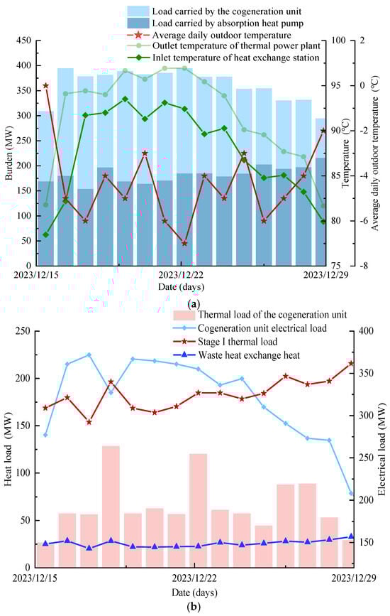 Figure 7 illustrates the actual operational data of the Stage I electricity and district heating systems. The load of the AHP fluctuated less during changes in the average daily outdoor temperature and stabilized at approximately 170 MW. The load stability indicates that the AHP does not require frequent operational adjustments under varying outdoor temperature conditions. On 15 December 2023, as the average daily outdoor temperature decreased sharply, both the outlet temperature of the thermal plant and the inlet temperature of the heat exchange station increased rapidly, leading to a significant increase in the system heat load. During this process, the load handled by the thermal power plant increased by 80 MW, whereas the AHP load increased by only 10 MW. The thermal power unit load fluctuated significantly with temperature variations. This phenomenon indicates that although the AHP can partially alleviate the load on the thermal power unit, the system continues to primarily rely on the thermal power unit to maintain heating stability during rapid thermal load increases.