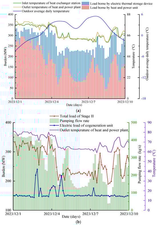 Outdoor temperature variations led to significant fluctuations in the thermal load, whereas the electrical load remained nearly constant at approximately 150 MW. On 9 December 2023, the thermal load surged from 190 to 310 MW; however, the electrical load remained stable. This stability was due to the electrical storage heating system, which stores thermal energy during periods of low demand and releases it during fluctuations, thereby smoothing out variations in the thermal load of the CHP system and preventing fluctuations in the electricity output caused by thermal load changes. Notably, between 1 and 10 December 2023, the electrical load underwent five significant fluctuations. For example, on 3 December, the electrical load rapidly increased from 150 to 250 MW, whereas the total thermal load for Stage II decreased significantly. This sudden increase in electricity demand may have been due to emergency grid dispatches or sudden spikes in external power requirements. During this period, the system scheduling strategy was adjusted to reallocate the resources originally intended for heat production to electricity generation. In a CHP system, the thermal power unit must dynamically adjust the thermal load output while ensuring a stable supply of electrical load, resulting in a temporary and significant decrease in the total thermal load in Stage II.