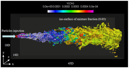 Non-reflecting boundary conditions are implemented at the inflow and outflow boundaries in the x direction, while the boundaries in the y and z directions are treated as no-slip and adiabatic walls. A hexahedral mesh system with three levels of refinement was utilized. Figure 2 illustrates the distribution of gaseous temperature, with the grid superimposed. The total number of grid cells is 45 million and the minimum cell size is 20 m. The size of the smallest eddy is about 10 m. Therefore, the Kolmogorov scale is solved with more than 0.5 grid point [16]. Additionally, the particle diameter is smaller than the grid size, indicating that the current setup satisfies the requirements of the point-source assumption [17].