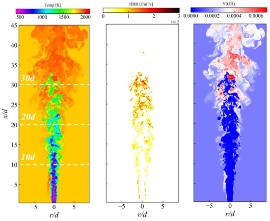 To illustrate the general characteristics of the liquid ammonia spray combustion process, Figure 3 presents the instantaneous distributions of gaseous temperature, heat release rate (HRR), and OH mass fraction in a typical plane. HRR is calculated as follows: