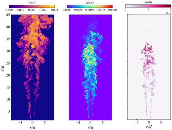 Instantaneous distributions of mass fractions of NO, N2O, and NH in a typical plane.