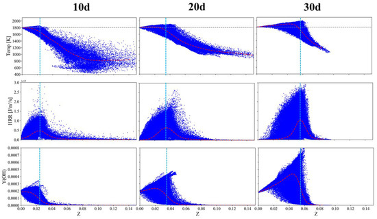 It can be observed that only a small number of the points exceed the ambient temperature (1800 K) at = 10, which are located in regions featured by relatively lean combustion. As the axial distance increases, the number of samples exceeding the initial ambient temperature increases. The variation in heat release rate also corroborates this observation. The peak value of the conditional mean of is located near Z = 0 at = 10. Note that the ambient is featured by Z = 0 according to the definition of Z. As chemical reactions proceed, a certain amount of OH is formed in the ambient, which could be observed from the instantaneous distribution of the OH mass fraction. We note that the peak of the instantaneous OH mass fraction is located near Z corresponding to the maximum HRR. The peak of the OH mass fraction in the upstream region is located within the lean mixture, where more oxygen was available. The peak of the OH mass fraction shifts to a richer mixture with increasing axial distance, where more fuel is available. Overall, the peak of gaseous temperature, HRR, and mass fraction of OH increases with increasing axial distance, and the peak shifts to the fuel-rich side.