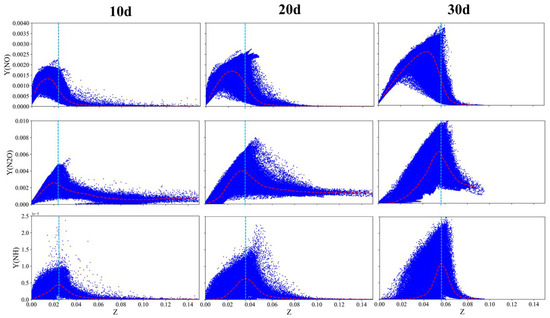 Scatter plots of mass fractions of NO, N2O, and NH versus Z at various locations. The red dashed line denotes the conditional mean. The blue dashed line represents the Z corresponding to the maximum HRR.
