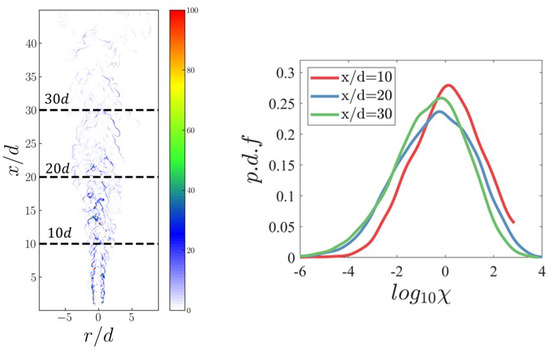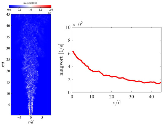 The scalar dissipation rate is a very important quantity in turbulence diffusion combustion. In the present work, is defined as , where D denotes the thermal diffusivity. Figure 7 (left) shows the instantaneous distribution of in a typical plane, revealing that high values are concentrated in the upstream regions, while relatively lower values are observed downstream. To quantify the results, Figure 7 (right) presents the probability density functions (PDFs) of the logarithm of at various locations. The results indicate that the probability associated with the highest values decreases as the axial distance increases. This trend is attributed to the substantial turbulence intensity in the near field of the jet flame, which enhances the mixing between fuel and oxidizer and leads to a significant gradient of Z. Consequently, is higher in the upstream region compared to the downstream region. The distribution of vorticity can serve as a manifestation of turbulence intensity. Figure 8 (left) shows the instantaneous distribution of the magnitude of vorticity in a typical plane. The evolution of conditional mean magnitude of vorticity conditionally along the axial direction is shown in Figure 8 (right). It can be seen that the magnitude of vorticity is higher in the upstream region and gradually decreases with increasing axial distance. This implies the evolution of turbulence intensity along the axial direction.