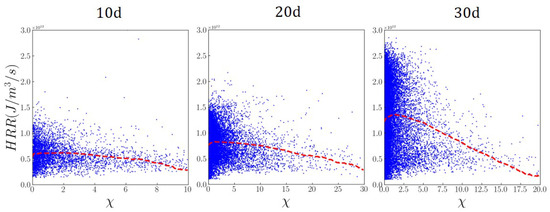 Figure 9 presents scatter plots of HRR versus at different locations. It can be seen that the samples tend to concentrate in regions featured by low , where the conditional mean of HRR is higher. Previous studies [33] have shown that high results in a strong heat loss. Conversely, low is conducive to autoignition.