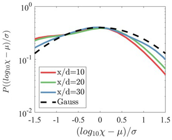 As depicted in Figure 10, the PDFs of the logarithm of , normalized by its mean and root mean square , are compared with Gaussian distributions. The results indicate that the distribution of at various locations is nearly log-normal. The PDFs exhibit minor deviations from a Gaussian distribution and are characterized by a negative skewness.