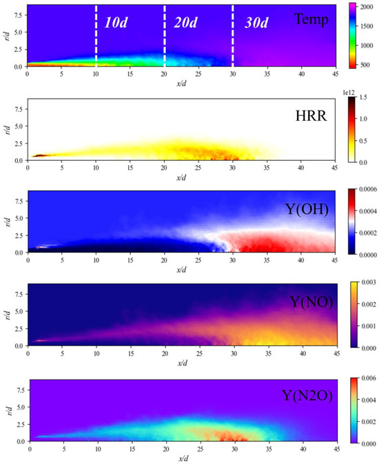Mean fields of gaseous temperature, HRR, and mass fractions of OH, NO, and N2O.