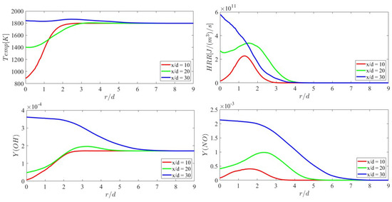 The mean flame structure is also studied. Figure 11 shows the mean fields of gaseous temperature, HRR, and mass fractions of OH, NO, and N2O. The mean fields are obtained through temporal and spatial averaging. It is clear that high temperatures predominantly occur in the downstream region. The reactions initially occur at the edge of the jet and, subsequently, the reaction zones converge downstream, characterized by high HRR. The distribution of OH and NO mass fractions is similar, with both mainly concentrated in the high-temperature region. It can be observed that N2O is primarily generated in the downstream region ranging from = 28 to = 32. For quantitative analysis, the mean profiles of gaseous temperature, HRR, and mass fractions of OH and NO at various locations are presented in Figure 12. It is found that the values of various quantities at the central axis of the jet increase with increasing axial distance. At = 30, the temperature at the jet axis exceeds the ambient temperature, and the peaks of HRR and mass fractions of OH and NO are located on the jet axis. The peaks of OH and NO mass fractions and HRR at = 10 and 20 are away from the jet axis. In general, the radial profile width of HRR is narrower than those of the mass fractions of OH and NO.