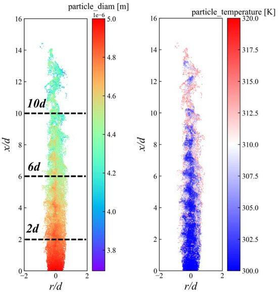 The evolution of ammonia spray is a critical fundamental aspect of ammonia spray combustion. Understanding the distribution characteristics of ammonia particles in present ammonia spray combustion is of significant interest. Figure 13 illustrates the distribution of ammonia particles, superimposed with particle diameter and temperature. It is found that the diameter of ammonia particles decreases with increasing axial distance due to evaporation. The radial width of the downstream ammonia particles gradually narrows due to the enhancement of the reaction. The ammonia particles are heated by the hot ambient, so the temperature of particles on both sides increases significantly.
