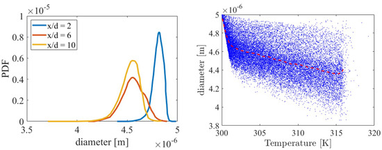 PDFs of the ammonia particle diameters at different downstream locations (left). Scatter plots of particle diameter versus particle temperature (right).