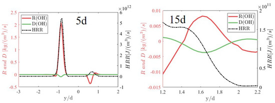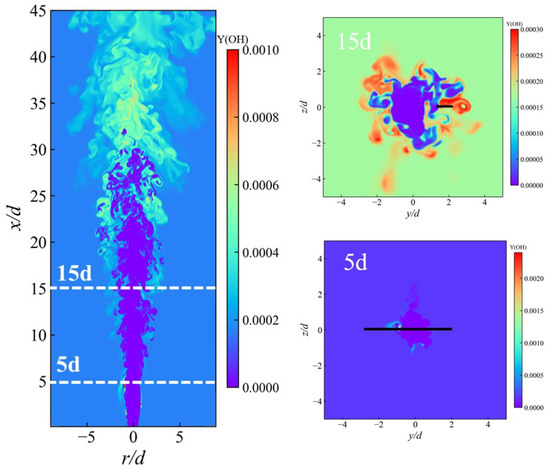 Figure 15 (left) illustrates the instantaneous distribution of the OH mass fraction in a typical plane, with specific axial locations at = 5 and 15 chosen for detailed analysis. The corresponding instantaneous distributions of the OH mass fraction across these planes are shown in Figure 15 (right). Figure 16 shows the species budget terms along typical lines in the planes. The results demonstrate that the reaction term R(OH) is markedly greater than the diffusion term D(OH) at = 5 and 15, suggesting that the auto-ignition mode plays a predominant role in turbulent ammonia spray flame stabilization.