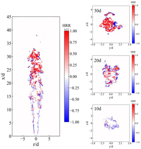 Figure 17 presents the instantaneous distribution of HRR in a typical plane (left) and three planes (right). The coexistence of premixed and non-premixed combustion modes is evident in the ammonia spray jet flame. This is because the fuel evaporation and mixing processes could lead to the formation of regions where the fuel and oxidizer are well-mixed, resulting in premixed combustion. Previous studies on spray combustion involving particle injection into a hot ambient have also observed the coexistence of premixed and non-premixed combustion [37,39]. In the upstream regions, both combustion modes were present at the jet edges, characterized by relatively low HRR. As the axial distance increases, premixed combustion becomes increasingly dominant, marked by higher HRR.