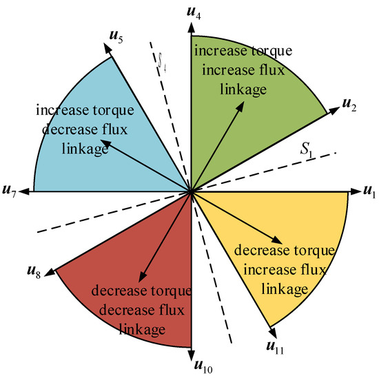 According to Equation (12), the electromagnetic torque dynamics are governed by the stator flux linkage amplitude variation and angular displacement. The maximum torque increment is achieved when the stator voltage vector leads the flux linkage vector by 90°, whereas a −90°phase lag induces maximal torque decrement, as established in [16]. In sector S1, the vector selection strategy is analytically determined:
