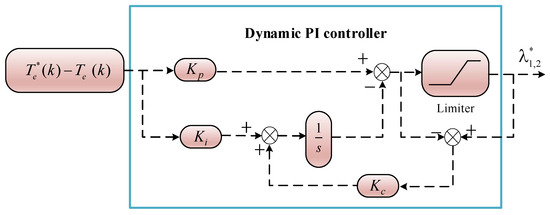 The system estimates the current torque according to Equation (9) and calculates the deviation from the set torque. Through the proportional–integral controller and limiter processing, the appropriate weight coefficient is obtained.