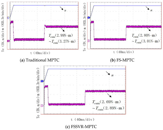 In order to verify the dynamic and steady-state performance of the three groups of control method under different operating conditions, the motor was set to load 20 N.m at 0.05 s. The load drops from 20 N.m to 10 N.m at 0.015 s. The motor torque Te variation curve is shown in Figure 10. The specific experimental data are shown in Table 3. Compared with the traditional MTPC, FS-MPTC has less time to reach the torque rating, and the torque jitter value is reduced by 15.72% during loading and 11.48% during unloading. The torque ripple is reduced by 10.7%. It can be seen that the FS-MPTC method is better at suppressing torque ripple and anti-interference performance. However, the torque jitter δ of the FSSVR-MPTC is reduced by 15.59% during loading and 9.5% during unloading, compared with the FS-MPTC method. The torque ripple is reduced by 19.41%. FSSVR-MPTC has the best effect in suppressing torque jitter and also combines the dynamic response advantage of the FS-MPTC strategy in less time to the rated torque.