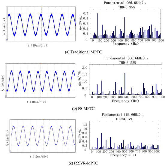 Figure 9 shows the phase current waveform and FFT analysis of the phase A current under the condition of loading 10 N.m in 0.1 s. The total harmonic distortions (THD) of the traditional MPTC, FS-MPTC, and FSSVR-MPTC are 3.95%, 3.52%, and 3.05%, respectively. Compared with the traditional MPTC, the THD of FS-MPTC is reduced by 10.08%, while that of the FSSVR-MPTC is reduced by 22%. The experimental results show that the FSSVR-MPTC can reduce the motor phase current distortion, reduce the harmonic content, and improve the waveform quality, so as to improve the control performance.
