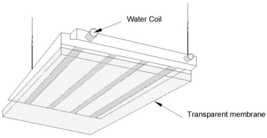 8] validated the thermal stability of PCM energy storage floors at a phase change temperature of 32 °C, achieving an energy-saving rate of 25–30%. However, there is limited research on integrated ceiling cooling, with only a few cases exploring PCM embedded in radiant panels to enhance thermal inertia. In 2023, Mohamed et al. compared the coupling effects of radiant ceilings and displacement ventilation, finding that PCM could reduce peak cooling loads by 12%, but issues such as phase change hysteresis and mismatched surface temperature control remain [