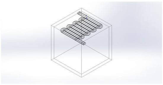 3, specific heat capacity: 920 J/(kg·K), thermal conductivity: 1.74 W/(m·K)). To simplify the model, a serpentine radiative cooling pipe system is integrated into the top of the enclosed space. The copper pipes feature a straight-groove cross-section (semi-circular pitch: 45 mm, radius: 22.5 mm, wall thickness: 2.5 mm), arranged in a serpentine layout covering the ceiling. The straight segments measure 490 mm in length, with bend radii of 55 mm, positioned 22.5 mm below the top inner surface. The enclosed space is filled with air, while water serves as the coolant in the pipes, with an inlet flow velocity of 0.65 m/s. Gravitational acceleration is set at −9.81 m/s