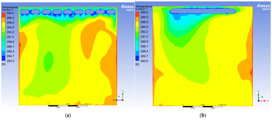 After 10 h of operation, the system transitioned to a quasi-steady state: Radiative (55%) and convective (45%) heat transfer reached equilibrium, with the thermal stratification index Γ decreasing by 12.5% and temperature distribution linearization. A stable dual-vortex natural convection structure (Re = 4.5 × 102) emerged, sustaining continuous thermal migration channels through wall-adjacent cold air descent. Corner temperature anomalies diminished to ΔT ≈ 0.3 K, demonstrating significant assimilation of local disturbances by primary vortex systems. The steady-state cooling power stabilized at 1.8 kW, achieving 57% energy savings compared to initial peak consumption, thereby validating the system’s operational efficiency in prolonged service.