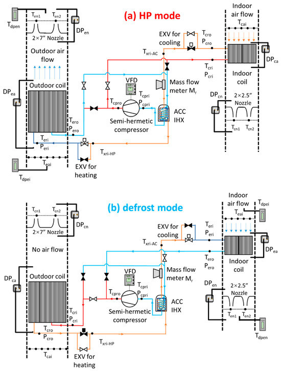 The experimental facility of the CO2 HP system in (a) HP mode and (b) defrost mode.