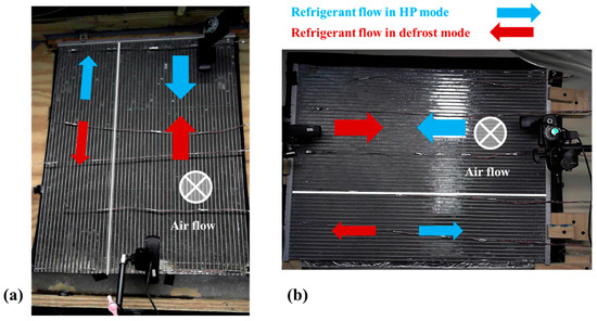 Figure 1 presents the experimental facility in two different working modes: HP and defrosting. Specifications of the key components in the system can be found in our previous work [26]. Sensors are installed to monitor the system behavior, and their ranges and uncertainties are given in Table 1. Adjusting the six ball valves in the refrigerant loop allows the system to switch between the two working modes by reversing the cycle. In addition, Figure 2 shows the microchannel outdoor heat exchangers used in this study, installed vertically and horizontally. It has one slab and two passes with 17 and 34 tubes in each pass. The overall dimension of the outdoor heat exchanger is 635 mm × 467 mm× 16 mm. The flow direction of the refrigerant in HP and defrost modes, as well as that of the air flow, is also given in the figure.