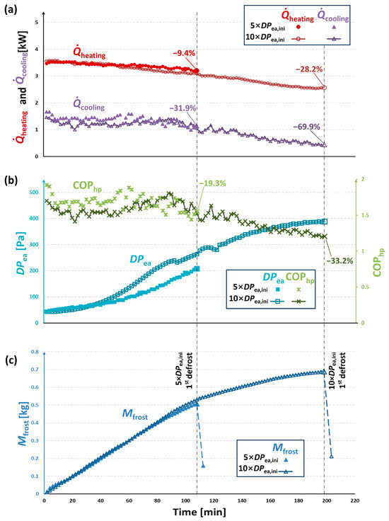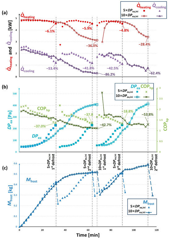 Figure 3 shows the CO2 HP system performance with different defrost-initiation criteria (5 or 10 × DPea,ini) under the 0 °C and 90% RH condition. In addition, the transient frost accumulation is also quantified in the figure. Similarly, the scenarios with ambient temperature at −5 °C and −10 °C are in Figure 4 and Figure 5.