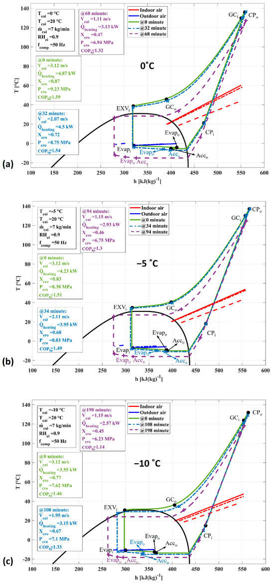 Figure 6 plots the shift in the T-h diagram of the CO2 HP cycle in the first frosting period with different ambient temperatures. Key operating parameters are also listed on the plots. It can be observed from Figure 6 that the cycle does not change too much from the beginning (green line) to the time point that DPea increases five times (blue dashed–dotted line). Such an observation agrees with the fact that the heating performance of the HP system ( and COPhp) only slightly degrades in the first frosting period with 5 × DPea,ini criterion. The major difference between the cycles at the beginning and when DPea increases five times is that as the frost grows on the outdoor evaporator and the cooling capacity drops, the refrigerant vapor quality at the evaporator exit xero decreases by 0.1–0.15. However, the vapor quality at the Acc exit xacc,ro stays almost the same, which indicates the liquid refrigerant migrates into the Acc. Therefore, the Acc holds the extra refrigerant due to frosting while the IHX keeps the suction superheat, and thus the discharge temperature Tcpro is almost constant when DPea increases five times under all three conditions. However, as the frost continues growing and densifying on the surface of the outdoor evaporator, the evaporating pressure and the cooling capacity further decrease. The Acc is completely flooded when DPea increases 10 times (purple dashed line in Figure 6). xero and xacc,ro drop by about 0.4 and 0.3 under the three conditions from the beginning to the time point when 10 × DPea,ini criterion is reached. The pressure and temperature at the compressor suction line decrease, so the mass flow rate drops with the reduced refrigerant density ρcpri at the inlet of the compressor. The discharge pressure pcpro also drops below the critical pressure of CO2 and the heating capacity drops significantly.