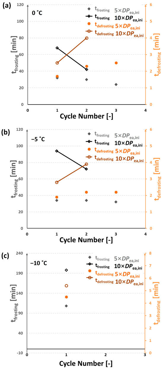 (a–c) The effects of defrost-initiation criterion on the frosting and defrosting time during continuous frosting–defrosting cycles under various temperatures and 90% RH conditions.