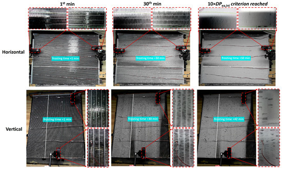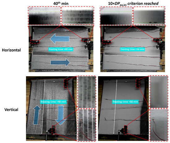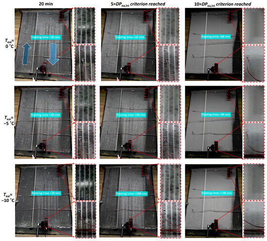 Reexamining the results in Figure 3 and combing the frost images in Figure 9, Figure 3b shows that compared to the first frosting period, the initial pressure drop of airflow DPea,ini of the second frosting period increases from 43.7 to 56.2 Pa (5 × DPea,ini criterion) and 58.0 Pa (10 × DPea,ini criterion) under 0 °C outdoor temperature. Similar results can be observed under −5 °C outdoor temperature (Figure 4b). The increased air-side pressure drop at the beginning of each frosting period verifies that a certain amount of water remains on the outdoor evaporator after defrosting, as shown in Figure 9.