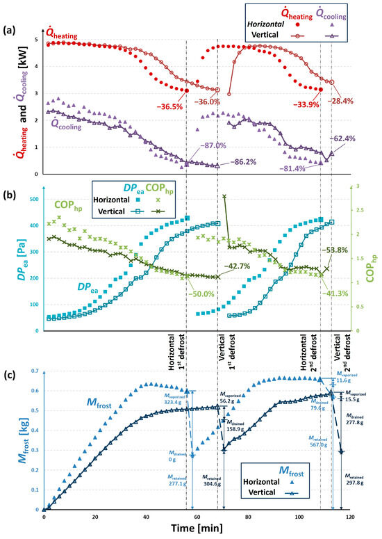 The effects of the outdoor heat exchanger orientation are explored under the 0 °C and 90% RH ambient condition with 10 × DPea,ini as the defrost-initiation criterion. The results are given in Figure 10.