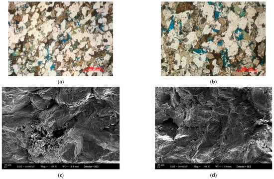 The reservoir predominantly exhibits medium-grained sandy structures with grain sizes ranging from 0.25 to 0.5 mm. The grains are well-sorted and range from sub-rounded to sub-angular, with cementation primarily occurring through intergranular bonding, characterized by point contacts between clasts, and displaying low structural maturity [11]. Overall, the reservoir is characterized by low porosity and ultra-low permeability, with porosities between 7% and 12% and permeabilities ranging from 0.04 to 1.00 × 10−3 μm2. The primary pore types are intergranular dissolution pores and intergranular pores, leading to relatively poor reservoir properties. Figure 1 shows the casting thin section and scanning electron microscopy (SEM) test results of the reservoir in the L oilfield.