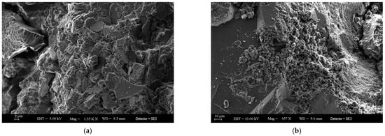 Comparison of scanning electron microscopy before and after waterflooding injury. (a) Before waterflooding, kaolinite appears in a vermicular form with a relatively intact crystal structure. (b) After waterflooding, kaolinite becomes fragmented and migrates to fill the dissolution pores.