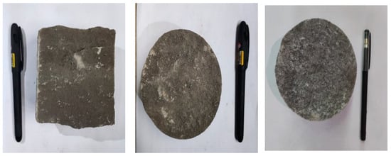 The experimental samples were sourced from the L reservoir, consisting of cylindrical core samples with a lithology of tight sandstone, as shown in Figure 8. To achieve the research objectives, core samples were selected for velocity impact experiments (three groups). Three groups of core samples with different permeability levels were chosen to investigate the effect of injection velocity on permeability, as shown in Table 3. The aim was to study the relationship between reservoir permeability changes and fluid flow velocity within the reservoir and to determine the critical flow velocity. The content of the rock photographs is as follows: