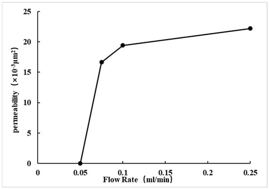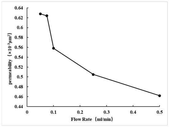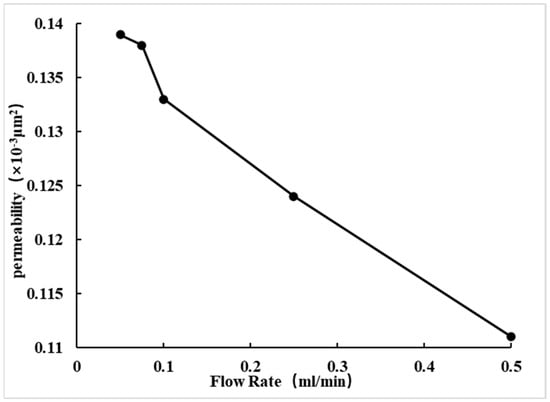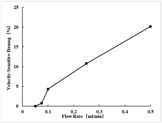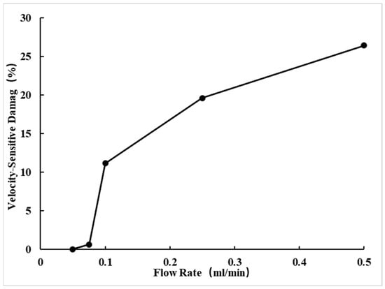 For Core No. 73, the gas-measured permeability falls within the range of 0.3~1 × 10−3 μm2. As the flow rate increases, the liquid-measured permeability gradually decreases, while the speed-sensitive damage value progressively increases, as shown in Table 6, Figure 11 and Figure 12. When the flow rate reaches 0.5 mL/min, the speed-sensitive damage value reaches 20.144%, determining the critical flow rate to be 0.25 mL/min.