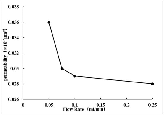 For Core No. 5, the gas-measured permeability is less than 0.3 × 10−3 μm2. As the flow rate increases, the liquid-measured permeability gradually decreases, while the speed-sensitive damage value progressively increases, as shown in Table 7, Figure 13 and Figure 14. When the flow rate reaches 0.25 mL/min, the speed-sensitive damage value reaches 22.222%, determining the critical flow rate to be 0.1 mL/min.
