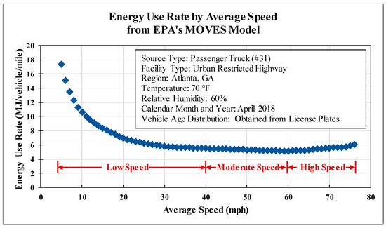 As a fundamental traffic flow parameter, the average speed is often used as an indicator of traffic conditions in traffic control and management (ramp metering, roadway tolling, etc.), and it is also one of the most important parameters in vehicle energy consumption modeling that links vehicle engine load fractions (e.g., vehicle specific power and opMode distributions) with on-road traffic operations [1,2]. Generally, vehicles driving at low average speeds (stop-and-go driving) and high average speeds (heavy engine load for cruising) both consume more energy and produce more emissions. The energy use rate–speed curve has a distinctive parabolic shape, with high energy use rates on both ends and low energy use rates at moderate speeds (e.g., approximately from 40 to 60 mph). An example of the energy use rate-speed curve (fleet average at Atlanta, GA) from MOVES-Matrix (which generates the same results as EPA’s Motor Vehicle Emission Simulator model, MOVES) [3,4] is shown in Figure 1.