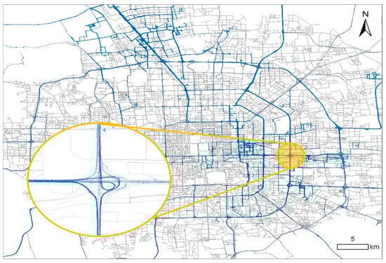 This study leverages real-world second-by-second vehicle operating data gathered between March 2020 and March 2022 in Beijing, China. These data were collected through the Statistics and Monitoring Platform for Energy and Emissions in Transportation (SMPEET), an initiative launched by the Beijing Municipal Commission of Transportation. The trajectory database utilized is not static but a dynamically updated system incorporating continuous data collection efforts across Beijing [9]. The SMPEET involves the installation of onboard diagnostics (OBD) devices in thousands of vehicles, capturing engine data and GPS information on a second-by-second basis following each vehicle ignition. In this paper, more than 25 million seconds of light-duty vehicle records are collected, including almost 8 million for EVs and 17 million for CVs. The trajectory data in the text come from 198 light-duty vehicles, including 22 pure electric vehicles. Previous studies have demonstrated that, for light-duty vehicles, brand type has little impact on VSP distribution [24], so our sample data do not distinguish between brand types. The data fields are as follows: vehicle ID, GPS speed, GPS time, longitude, and latitude. The dataset is matched with the road network covering all road types, including expressways, major arterial roads, minor arterial roads, and local roads, which can be used to develop facility- and speed-specific VSP distributions.