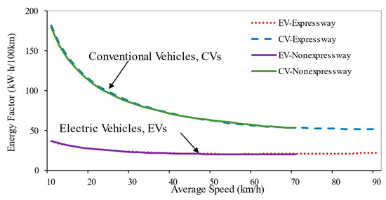 where denotes the average vehicle speed (km/h); represents the energy factor (kWh/km).