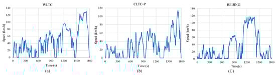 Figure 4. Driving cycle of WLTC (a), CLTC-P (b), and Beijing (using Real World Operation Data) (c). - (2)