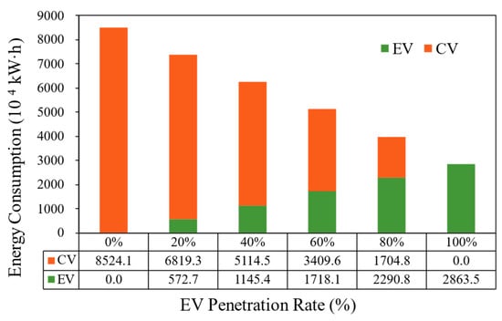 As indicated in Table 1, CVs exhibit energy consumption levels 2.8–3.5 times higher than EVs, underscoring the substantial energy conservation potential of EV adoption. To evaluate road-network-level energy savings for EVs in Beijing, daily energy consumption is calculated using the city’s daily vehicle kilometers traveled (VKT) and visualized in Figure 5. For instance, at a 20% EV penetration rate, 20% of total VKT is paired with the EV energy factor to derive EV energy use (572.7 × 104 kWh). A full transition from 0% to 100% EV penetration reduces total energy consumption by 66.4%.
