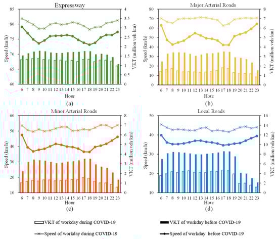 The road network speed and VKT in the pre-pandemic urban mobility pattern and the pandemic lockdown-enabled uncongested pattern: (a) Expressway; (b) Major arterial road; (c) Minor arterial road; (d) Local roads.