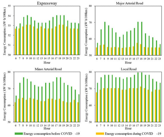 The energy consumption of CVs by hour is shown in Figure 8. It is obtained by combining the network-level average speed for four road types and the CVs energy factor. The results are as follows. (1) The hourly energy consumption of CVs declines with ascending road hierarchy. This pattern confirms that CVs achieve optimal fuel efficiency on high-grade roadways. (2) During pandemic-induced lockdown, road network-wide average speeds increase, consequently triggering a systemic reduction in CV energy consumption across all road hierarchy levels. (3) During the COVID-19 period, CVs exhibited energy consumption reductions of 1% on expressways, 14% on major arterial roads, 13% on minor arterial roads, and 9% on local roads, respectively.